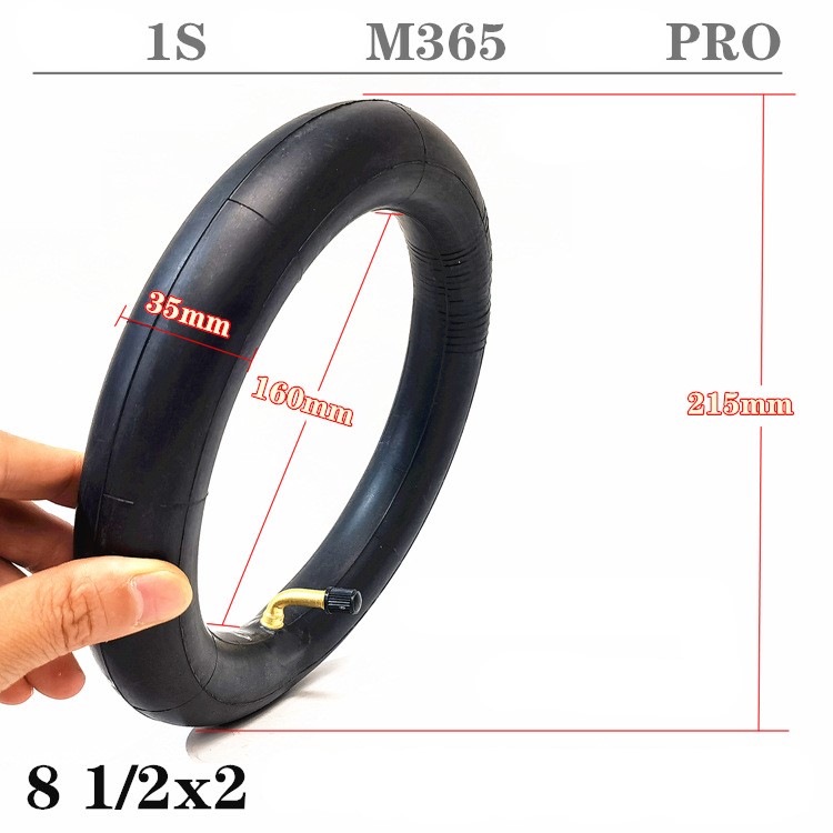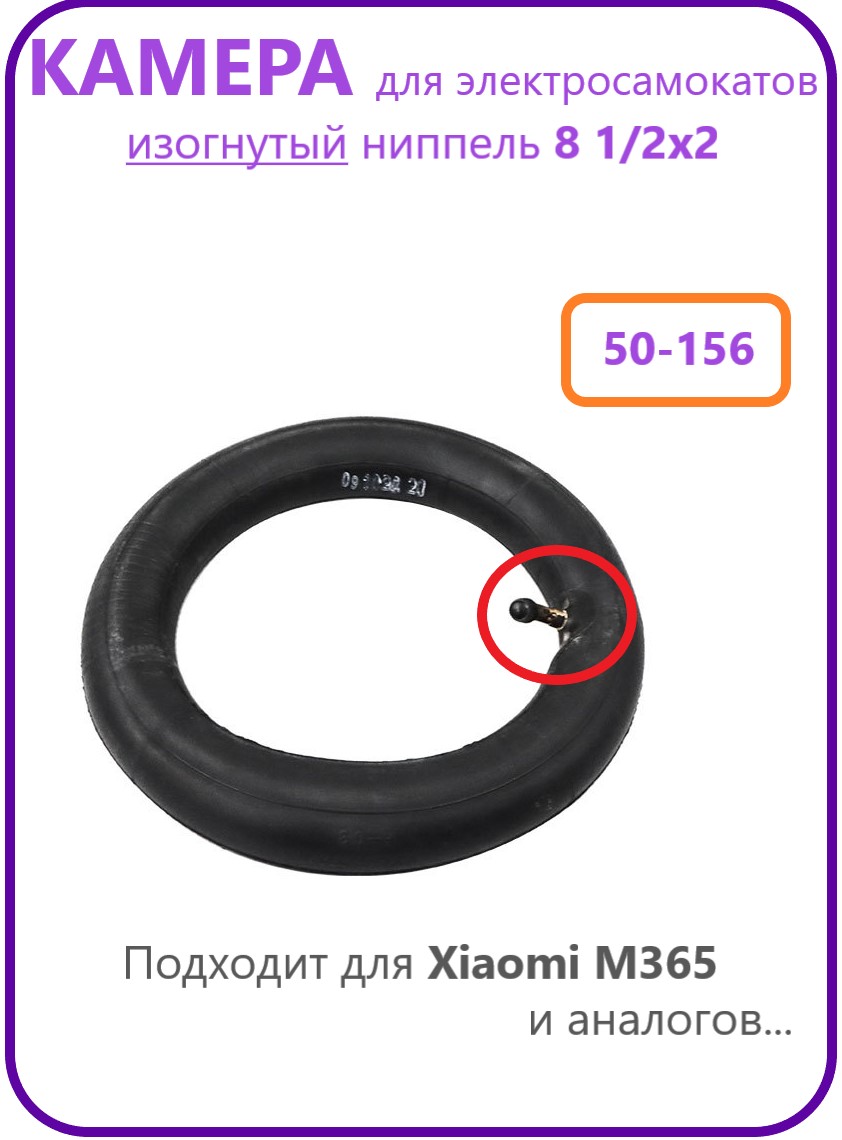 Камера для электросамокатов Xiaomi серии M365 с размером 8 1/2х2 дюйма (метрический 50-156). Оснащена ниппелем, изогнутым под углом 45 градусов, что обеспечивает удобство подключения насоса в условиях ограниченного пространства.